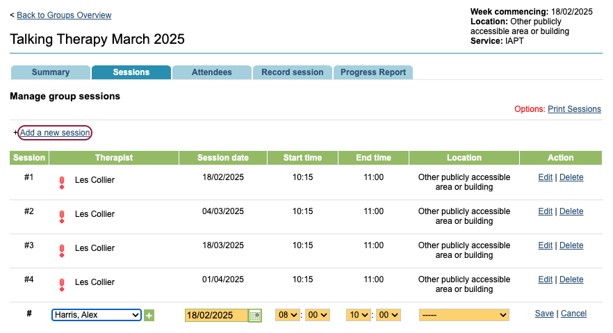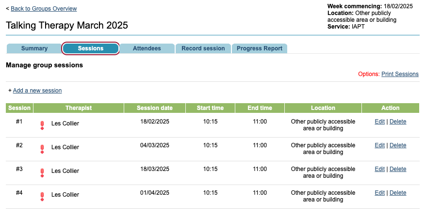 Here you will see the sessions that have been created so far with key information. The red exclamation mark is reminding you that the therapist hasn’t included their availability for this. You can edit or delete a specific session.