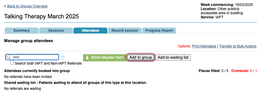 The ‘Search both IAPT and Non-IAPT Referrals’ option will find referrals that belong to both treatment types so they can both attend the same group. There is an option in the Control Panel for Superusers to enable or disable this option.