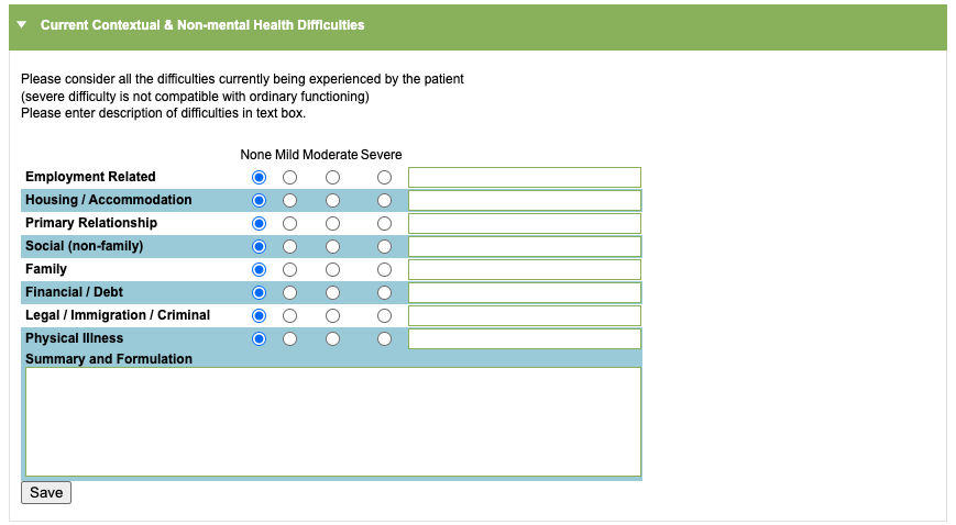 In the Current Contextual & Non-mental Health Difficulties tab you can record any additional difficulties being faced by the patient.