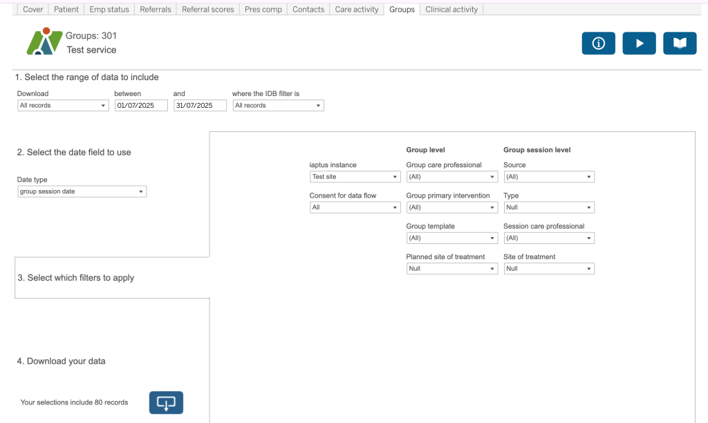- This allows you to select the records and select, where applicable, the date range, consent etc.