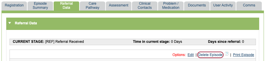 Superusers can only delete a patient referral if there are no clinical contacts or other treatment information attached to the referral. If this has not been added or if this has already been removed, Superusers will be able to select the ‘Delete’ option.