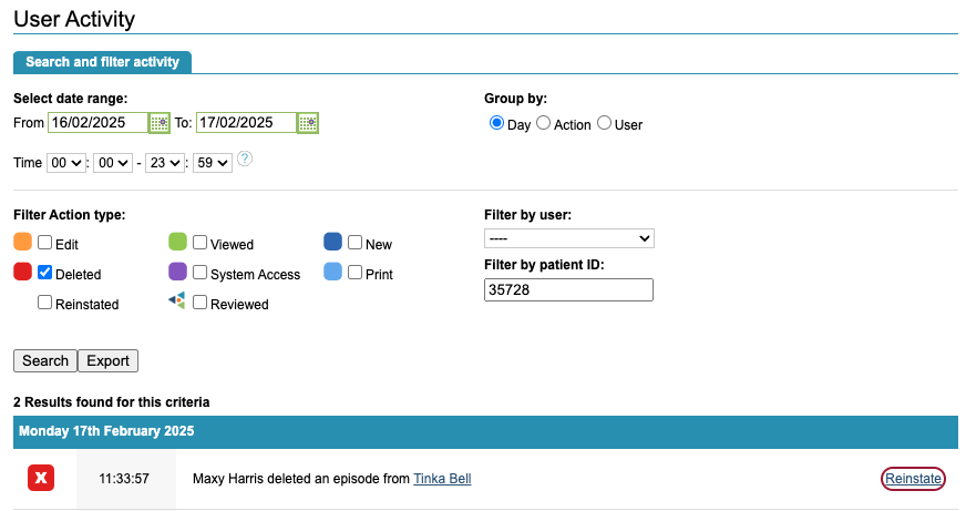 If an episode of care has been deleted by accident, a Superuser can reinstate this using the User Activity option in the Superuser menu.