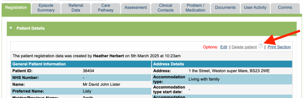 Superusers can delete a patient if there are no treatment episodes for that patient. If the patient has treatment data, and potentially clinical contact data too, this will need to be deleted first. If the record is a duplicate patient, the records can be merged by a Superuser, using the Patient Merge tool.