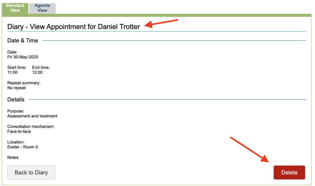 Appointments can be deleted by all users (admin and therapists, regardless of Superuser rights or not) through the diary by clicking on the appointment.