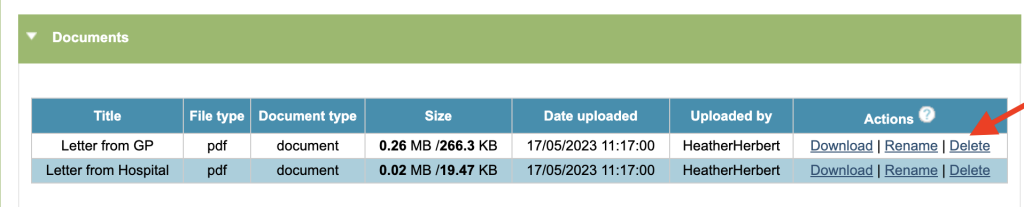 Superusers can rename or delete upload documents. Other users can delete and rename documents for 48hrs after the document is uploaded.