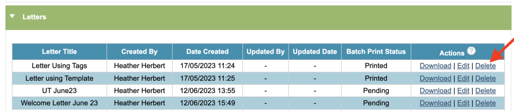Superusers can edit or delete letters. Other users can see the delete and edit options for 48hrs after the letter is saved, or until the letter is printed by admin staff, if it is save to batch printing and printed within the 48hr period.