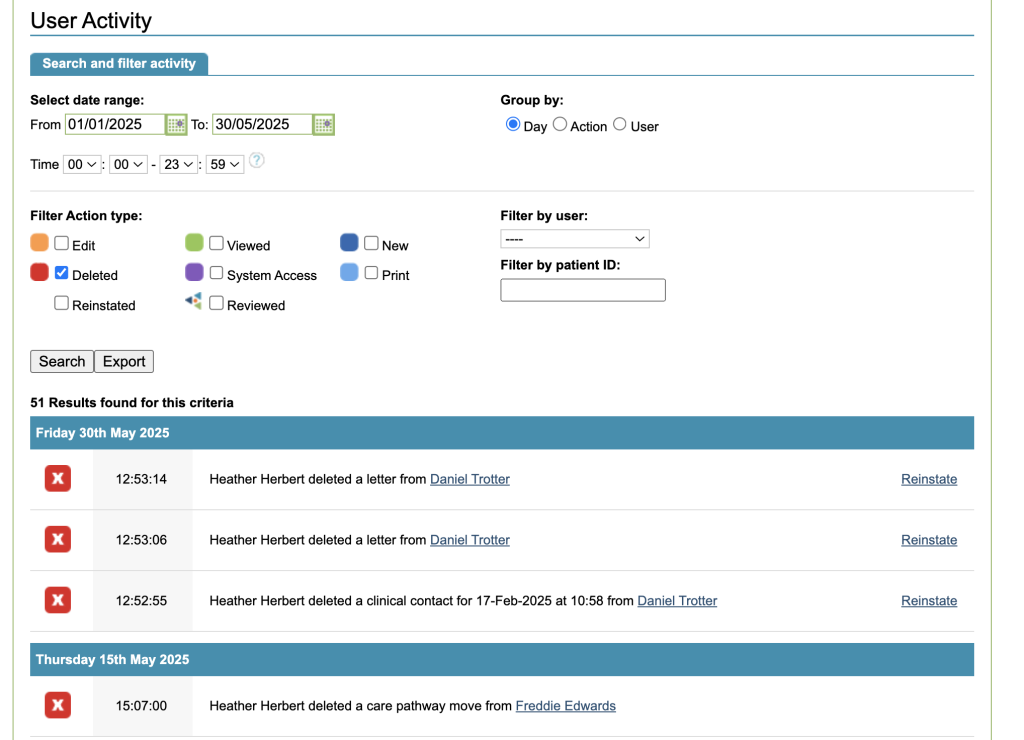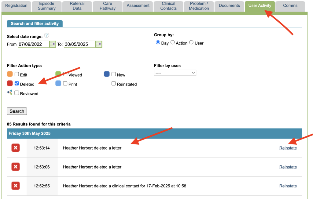 The user activity tab allows you to search activity against the patient record. This acts as an audit of what has been deleted.