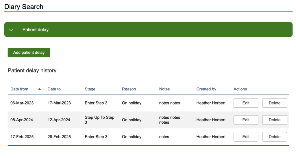 When you select Diary Search, the first section will be the Patient delay, if expanded, it will list the currently select patients delays, past and future.