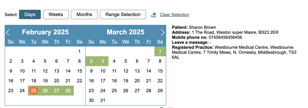 Next will be a calendar showing 2 months at a time and the selected patient on the right.