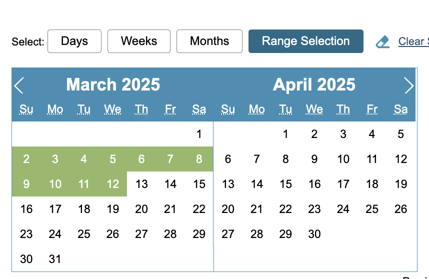 You search for a date or dates range using the buttons above the calendar. T here is also a Clear Selection option, that will reset you search