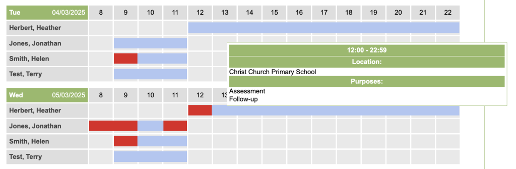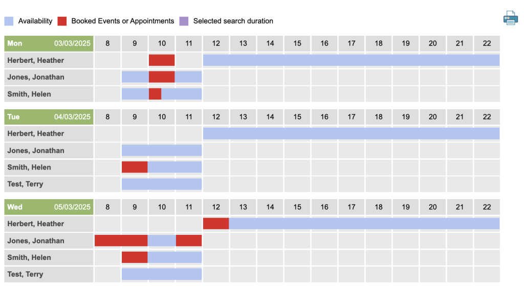 Results will appear at the bottom as a table. It will list by Date and then under the date will be a row for each therapist that has availability. To the right is the availability broken down by hourly time slots. You will also see a key explaining what the colours represent. Red – Booked, Blue – Availability and Lilac – Selected duration (taken from the Start and End Time).