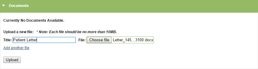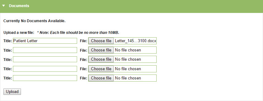 The Documents area allows additional files to be uploaded and saved to the referral.