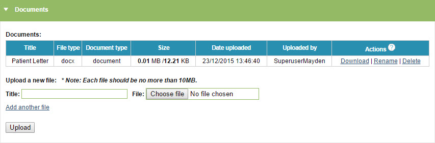 Once a document has been uploaded, this will appear in a table along with further information about the upload. Documents can be downloaded again to view at any time. Users will have the option to delete or rename the document for 48 hours after it has been uploaded – after this period has elapsed only superusers have this function
