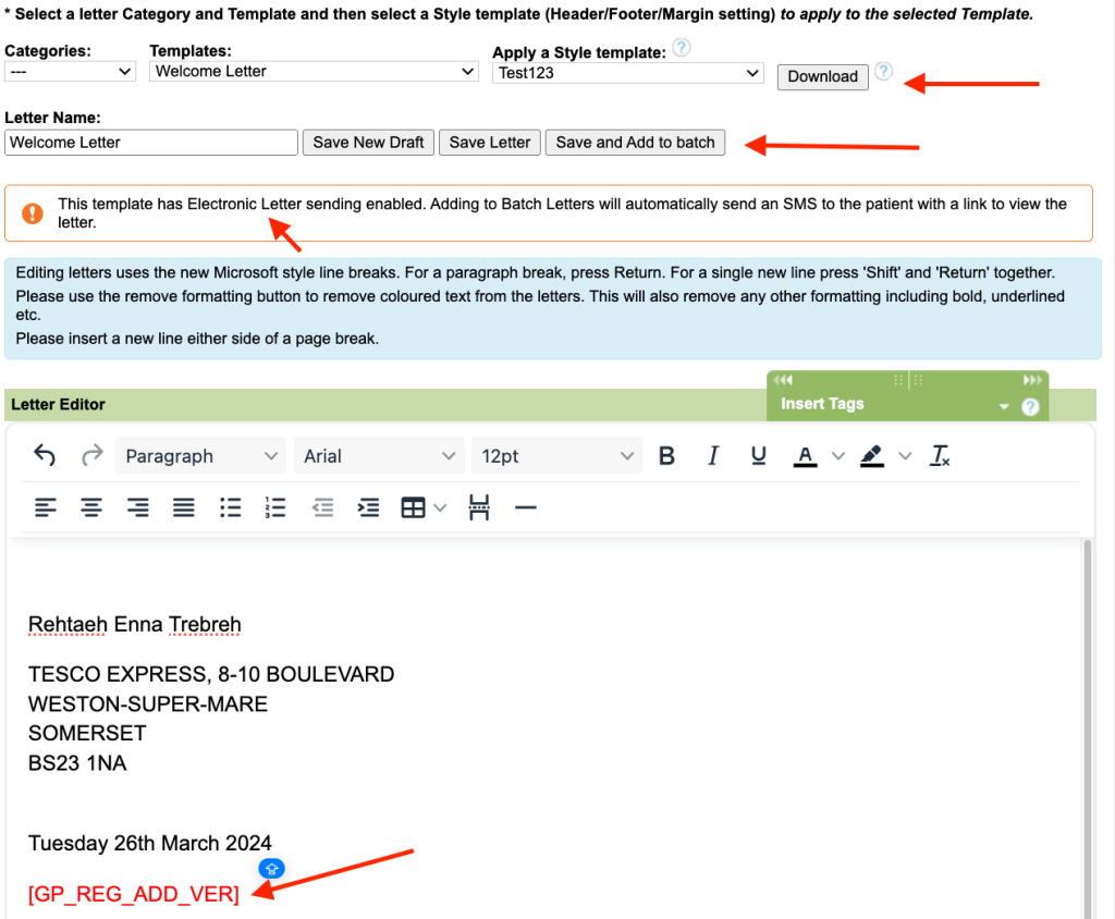 To pull information from the patient record, the letter tag function can be used. This appears as a green box with the title Insert tags and can be minimised, maximised, or moved to the other side of the letter editor area.