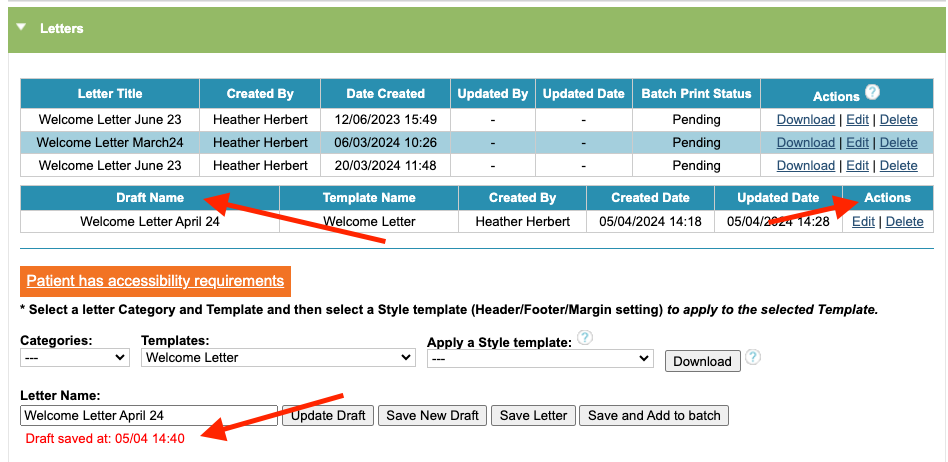 Letters is an area of iaptus that has an autosave function. Your letter will automatically be saved as a draft every 2 minutes. You don’t need to do anything at this stage, as when you save the letter the draft will automatically be deleted. If however, you have inadvertently closed the patient record, when you view the letter you will see the saved draft, you can then use the action options to either Edit or Delete the letter.