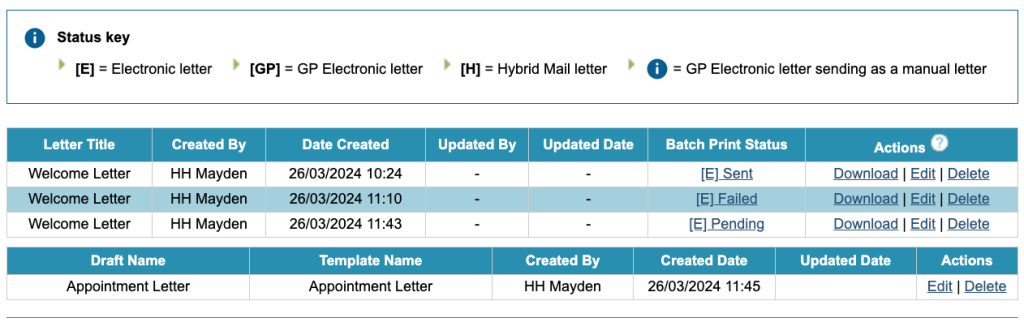 Once the letter has been saved, either as a draft or as complete, it will appear in a new table summarising the letter details.