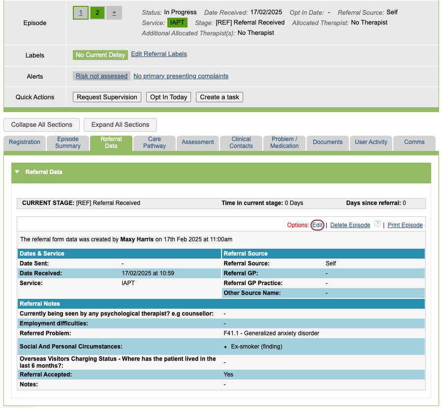 To edit a patient’s referral, find the patient record and select the correct referral on the boarding card(if they have more than one). Go to the Referral Data tab and click Edit.