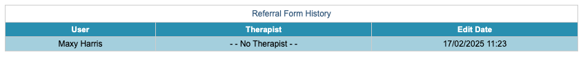 All changes made to the Referral form will be logged in the History table. You will see who made the changes, which therapist the patient was allocated to at the time and the date and time the changes were made.