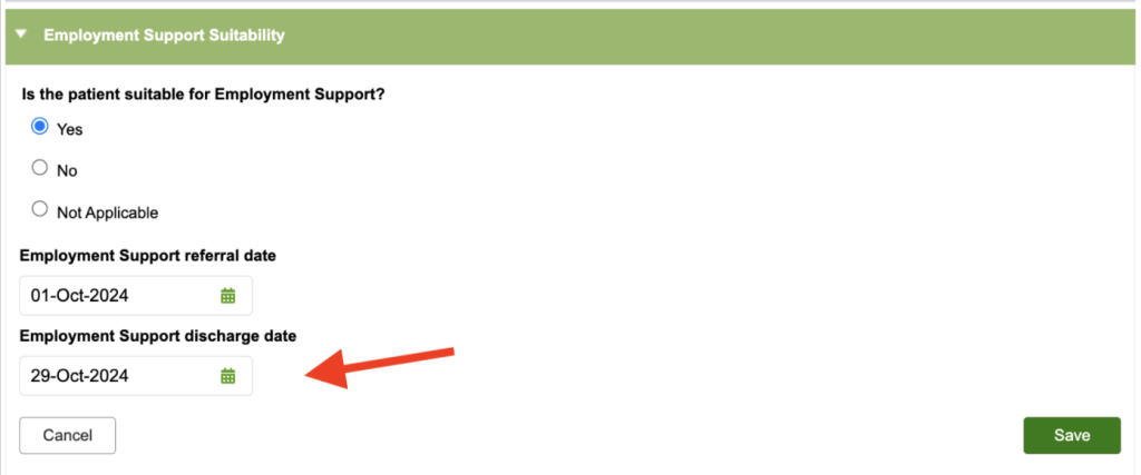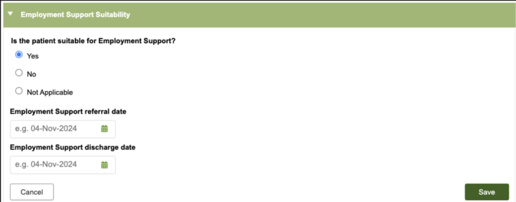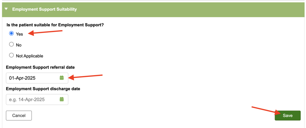 To add the information, click edit and select “Yes” for the question “Is the patient suitable for employment support?” Choose the referral dates from the calendar drop down and click save.