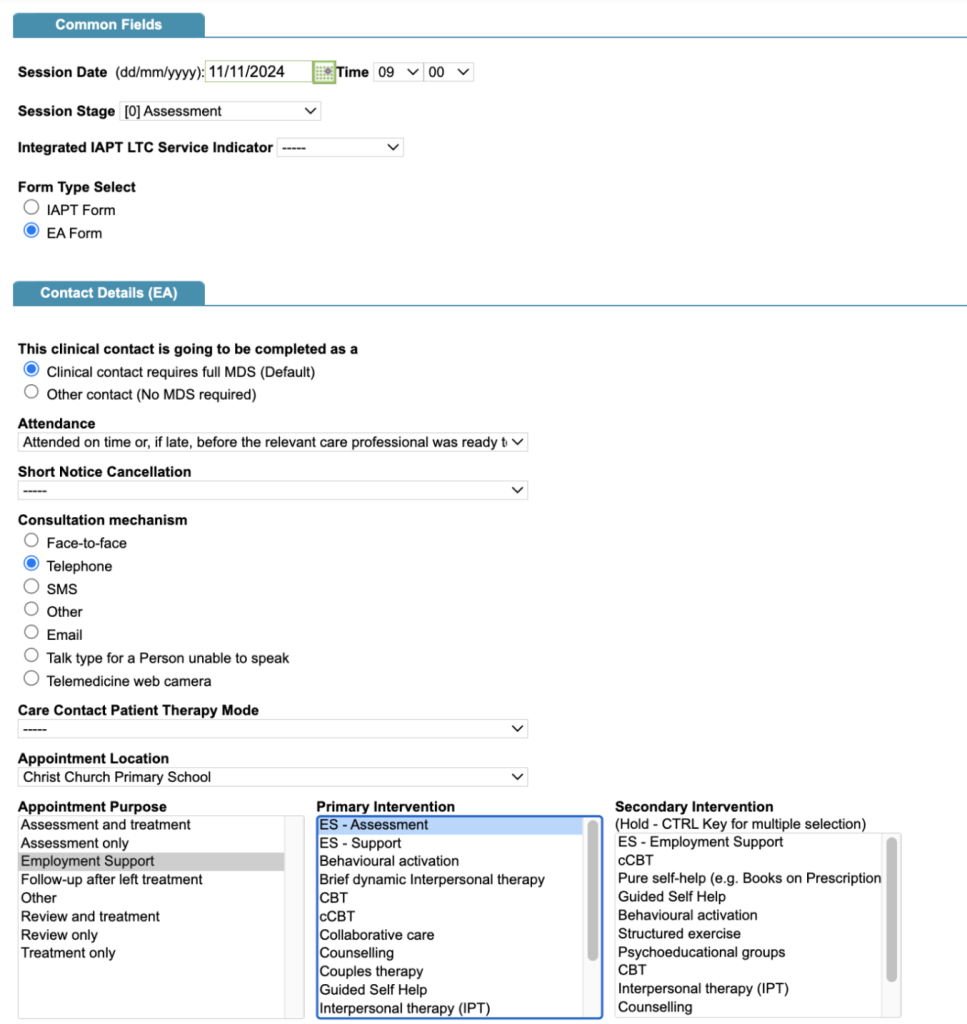 The first way is to use a single episode of care, with the Employment advisor(s) using the ‘EA Form’ Clinical Contact form and the Therapist using the ‘IAPT form’ Clinical Contact Form option. At the top of the Clinical Contact form, shown below, there is a radio button that allows the form to be switched from IAPT to EA or visa versa.
