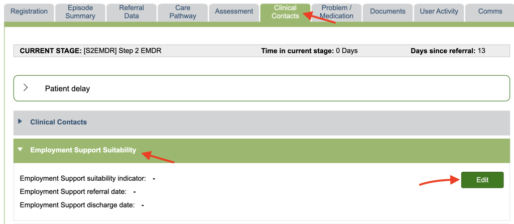 Goto the Clinical Contacts tab, Open the Employment Support Suitability section and select Edit.