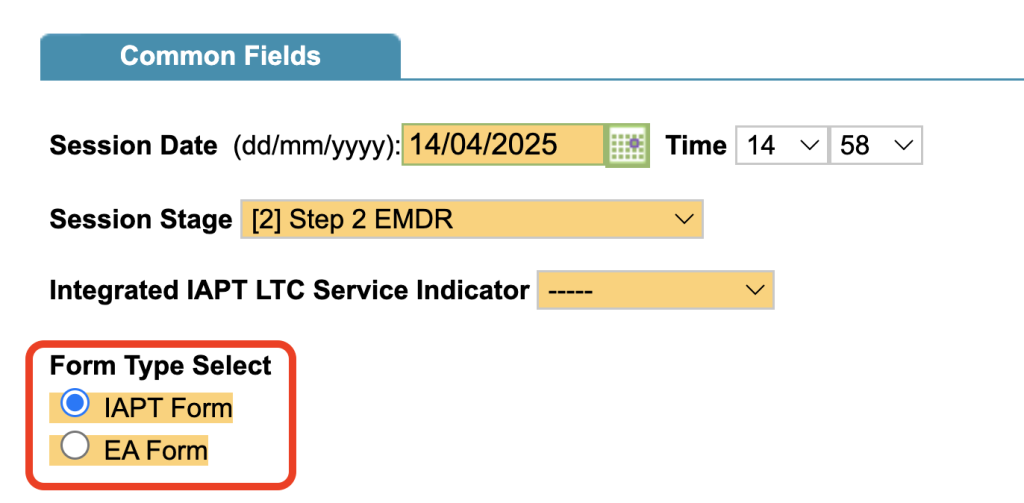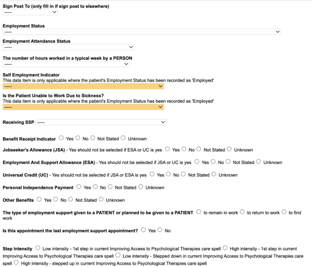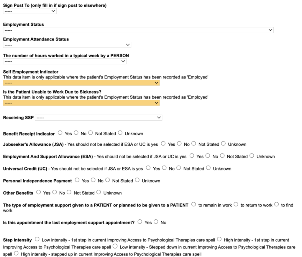 The IAPT form is the standard Talking Therapies contact form, and the EA form is a trimmed-down version excluding the outcome measures. All of the Employment data fields are available in either form.