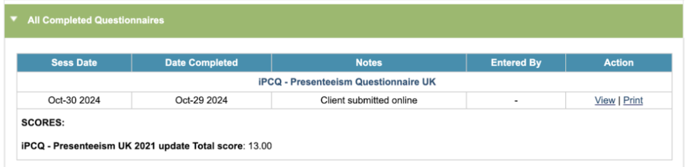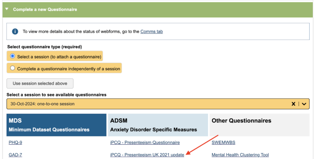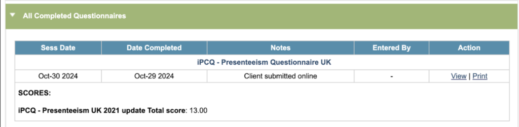 If the iPCQ wasn’t sent online then it can be completed from the Clinical Contact. Select the contact in the Carousel and click on the Fill in Questionnaire link. This will jump you to the bottom of the page, and select the date of the session. Select the iPCQ Presenteeism UK 2021 link to open and complete the questionnaire.