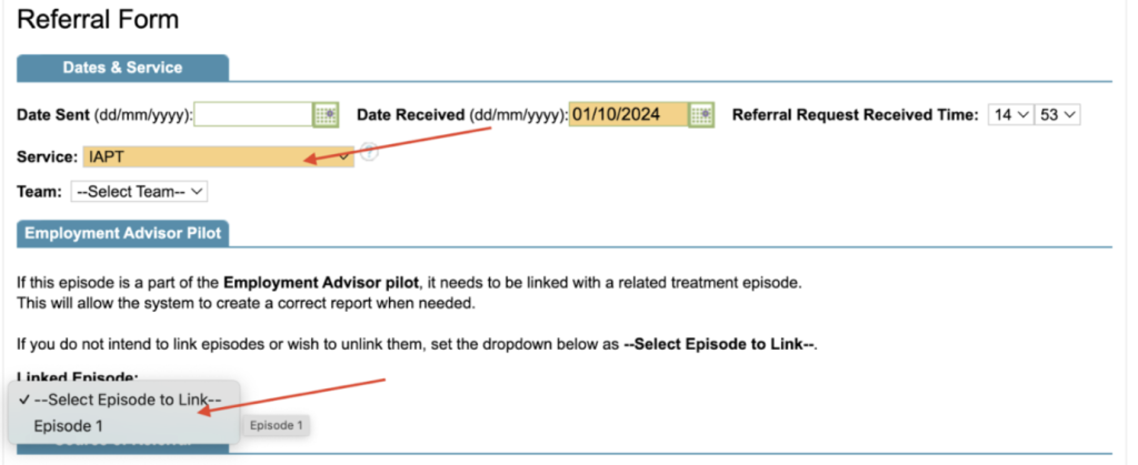 Next, under the Employment Advisor tab, in the Linked Episode section, select the Talking Therapies referral by selecting the number you noted earlier. This will then link the two episodes of care together in your reporting.