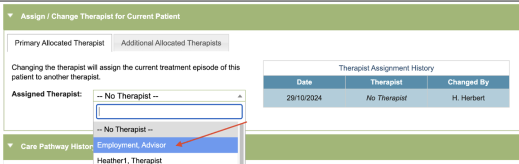 - You have one single primary allocated therapist. Your employment advisors will need to either: be aware of the referral or be made the additional therapist.