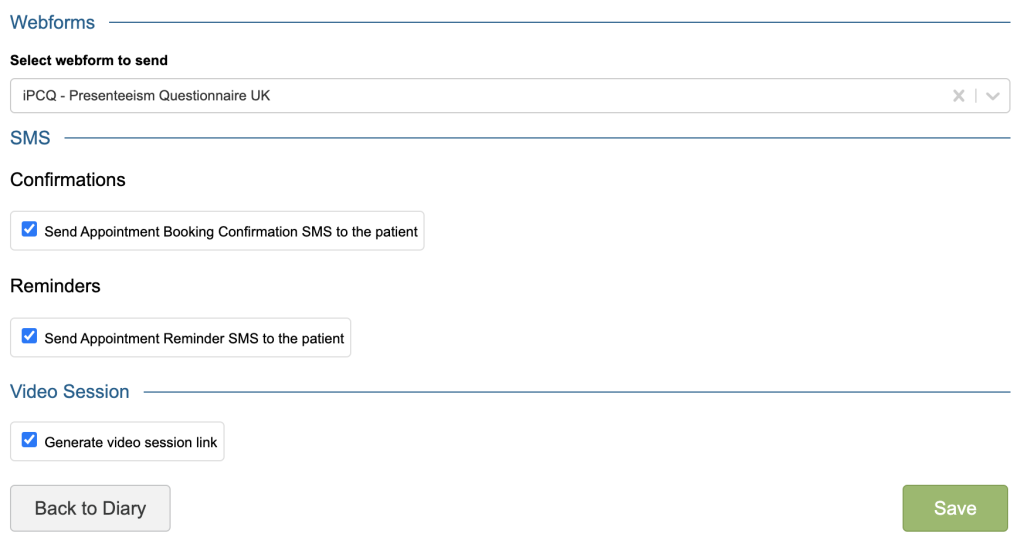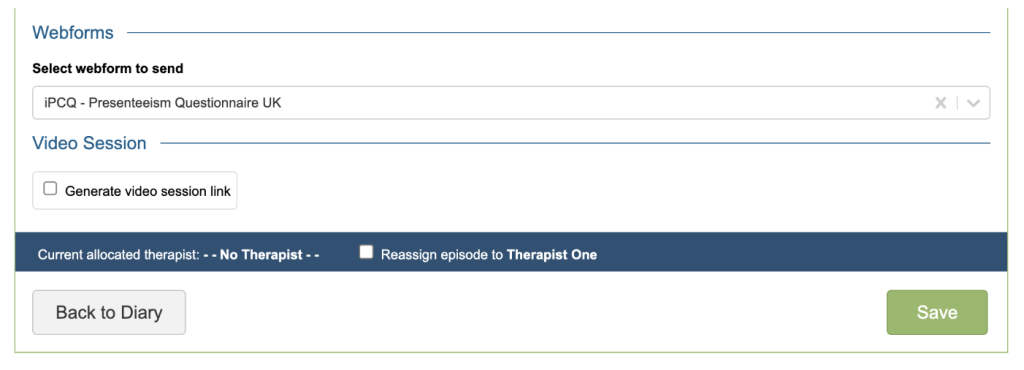 If your service has opted in to use online questionnaires (webforms) you will be able to select the iPCQ from the drop down. This will send the patient a secure link to the questionnaire that can be completed ahead of the appointment.