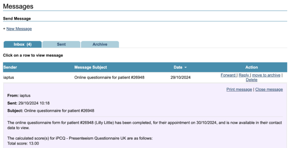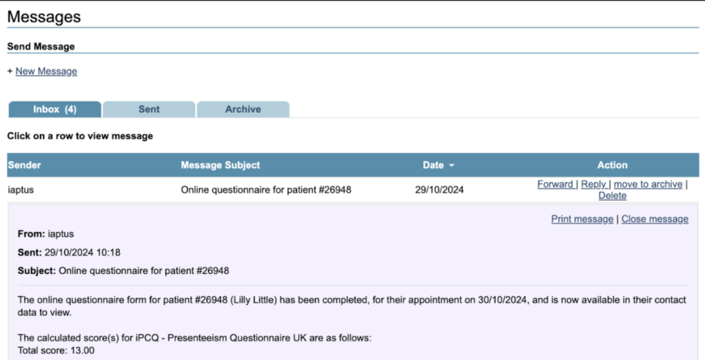 Once the patient has completed the questionnaire the Allocated Employment Advisor will receive a message in the Messaging area alerting that the questionnaire has been completed.