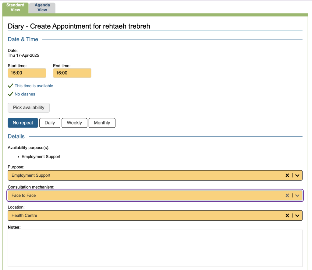 Add the Employment appointment in the diary and save. This appointment has now been created.