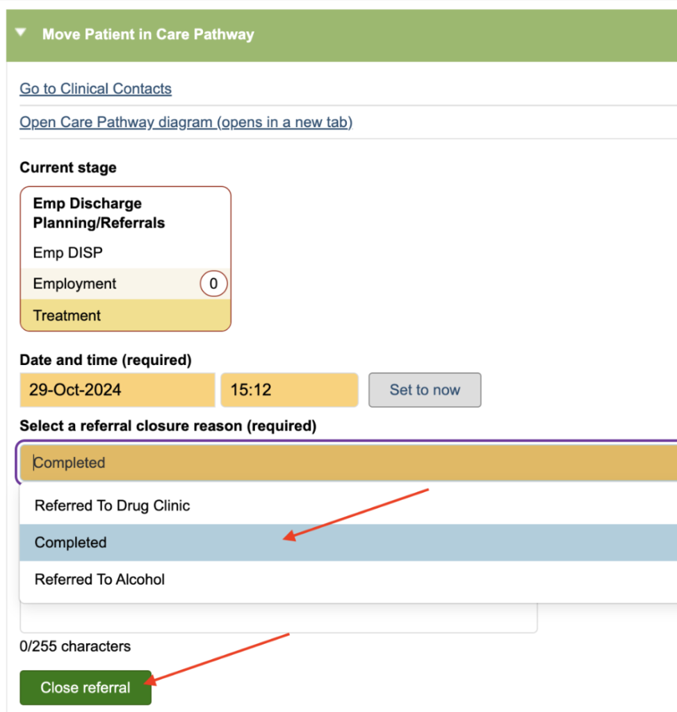 Next click on the Select a referral closure reason drop down and select the reason, add to any notes, and click on Close referral.