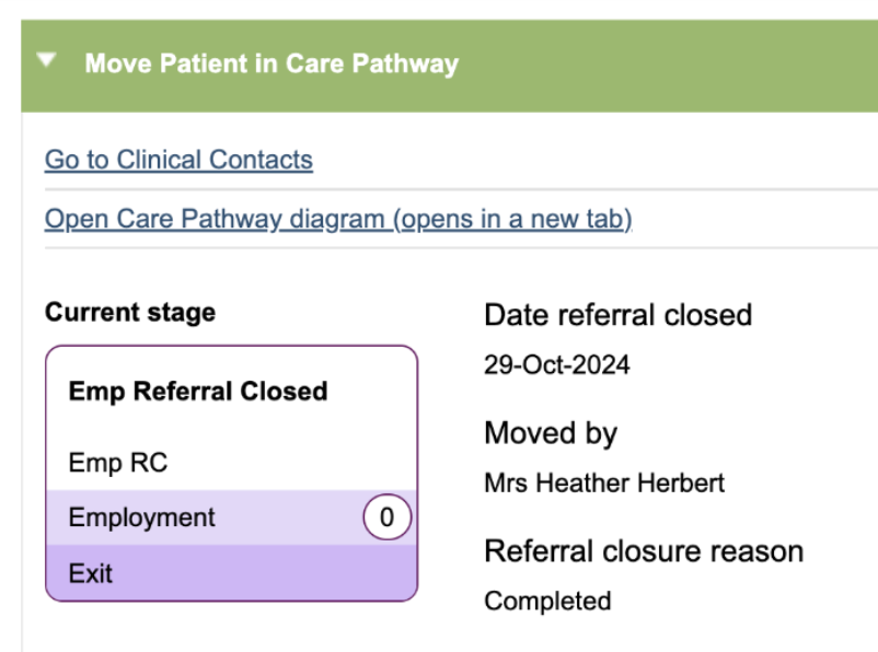 Once Employment Support has concluded it is time to discharge the patient. You can do this by going to the Care Pathway tab.