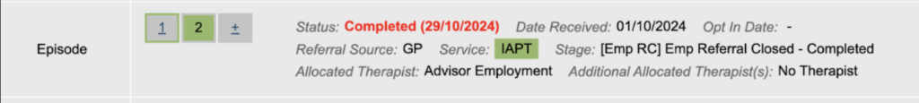 The second option is having two separate episodes, IAPT and one for EA, that are then linked together for reporting purposes. NHS England requires Talking Therapies and Employment Support data to be submitted as a single referral/episode.