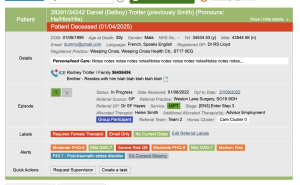 Deceased patients cannot be harmed, therefore there are no safety considerations. However, it is imperative that system users undertake the necessary checks to ensure that the decease patient has any letters deleted, appointments cancelled and Electronic Questionnaires (webforms) stopped. The NHS Number should be used as the unique patient identifier wherever possible. If this is not possible, then a combination of iaptus ID, DOB and full name.