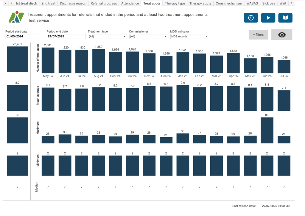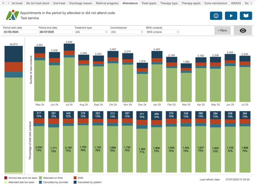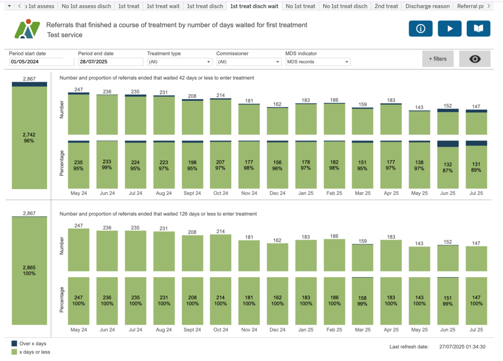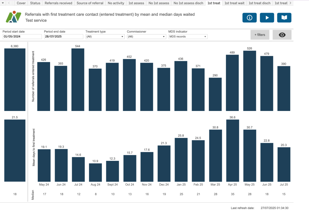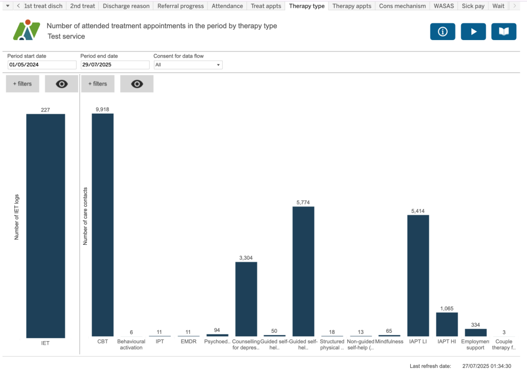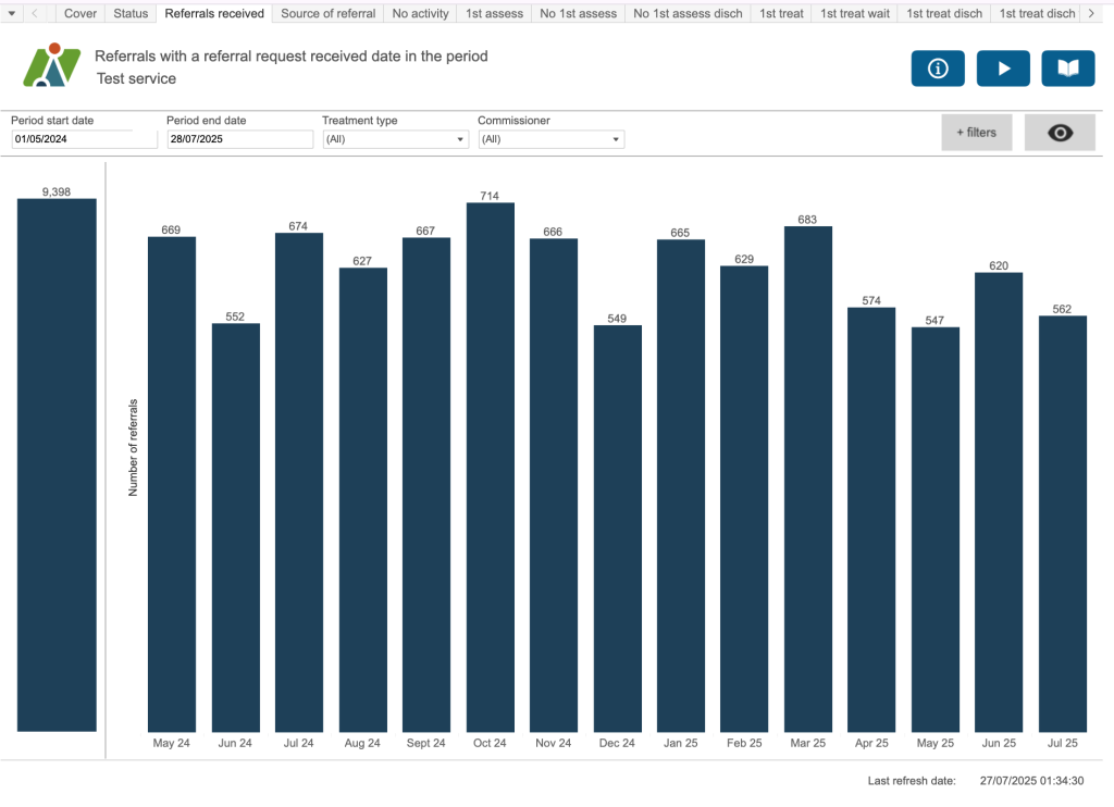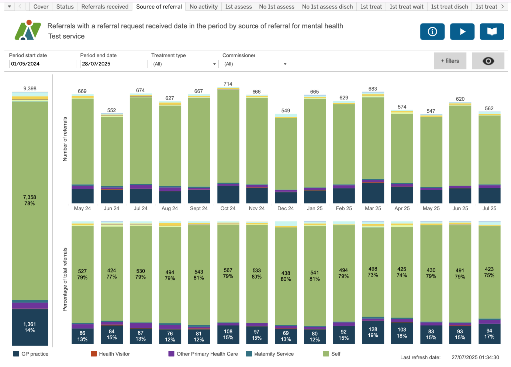 Please remember that the NHS England reports are based on a snapshot of data provided after the month end. These dashboards will reflect the data that is currently in iaptus (as per the last refresh date shown at the bottom of the dashboards) and so may have been updated since submission to NHS England.