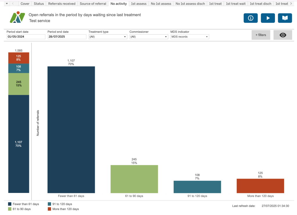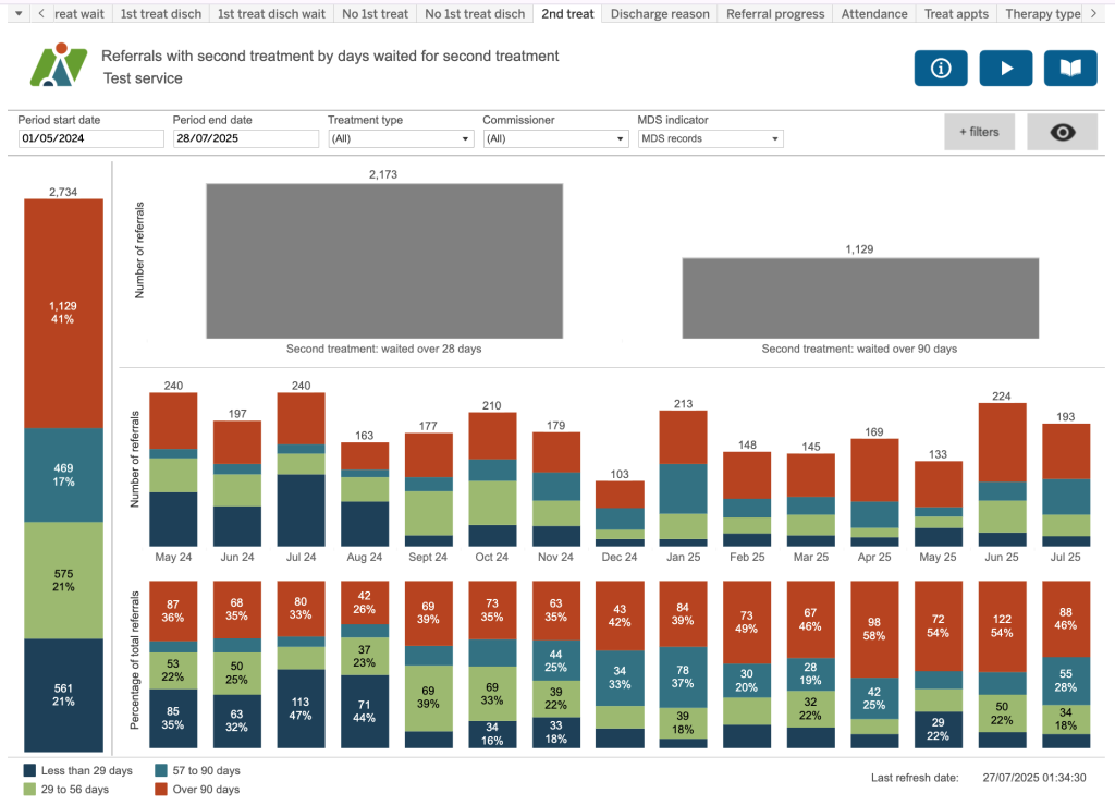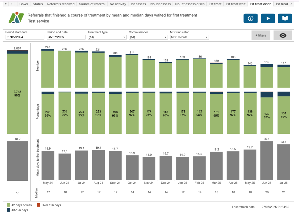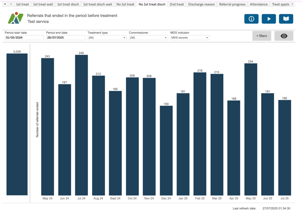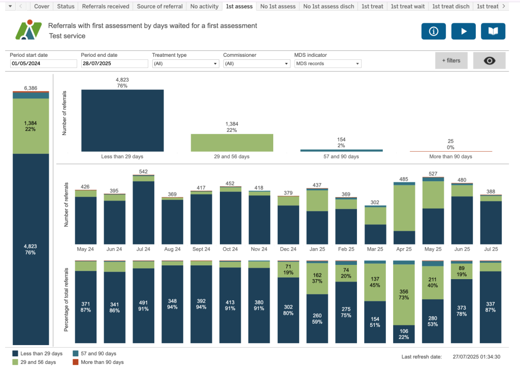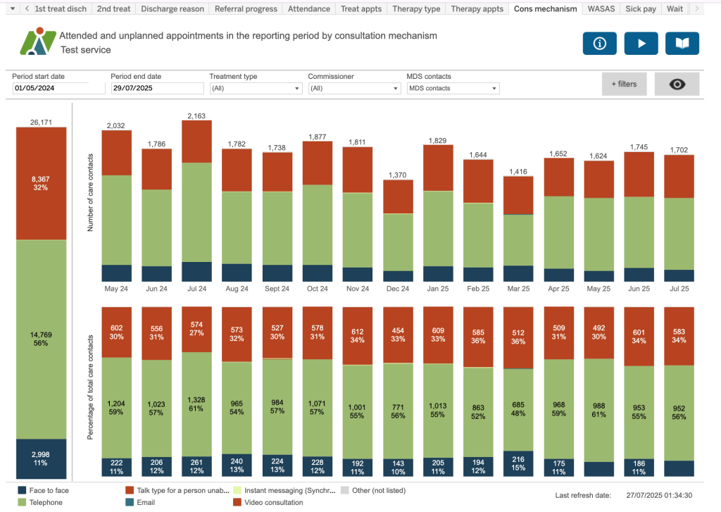Please remember that the NHS England reports are based on a snapshot of data provided after the month end. These dashboards will reflect the data that is currently in iaptus (as per the last refresh date shown at the bottom of the dashboards) and so may have been updated since submission to NHS England.