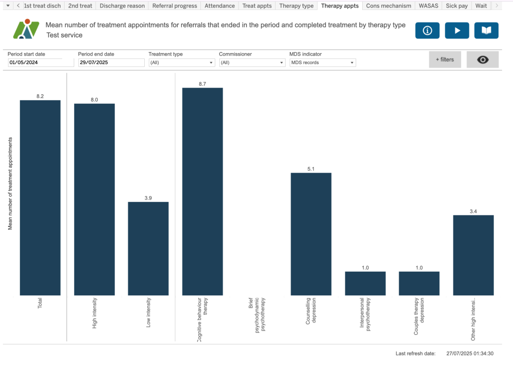 Mean number of treatment appointments for referrals that ended in the period and completed treatment by therapy type