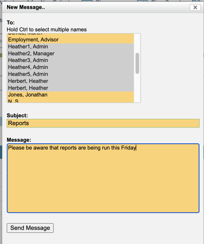 Select the name of the person the message should be sent to. To select multiple people, hold the Ctrl key whilst selecting the other recipients names. Add the subject and the message, and then press Send Message.