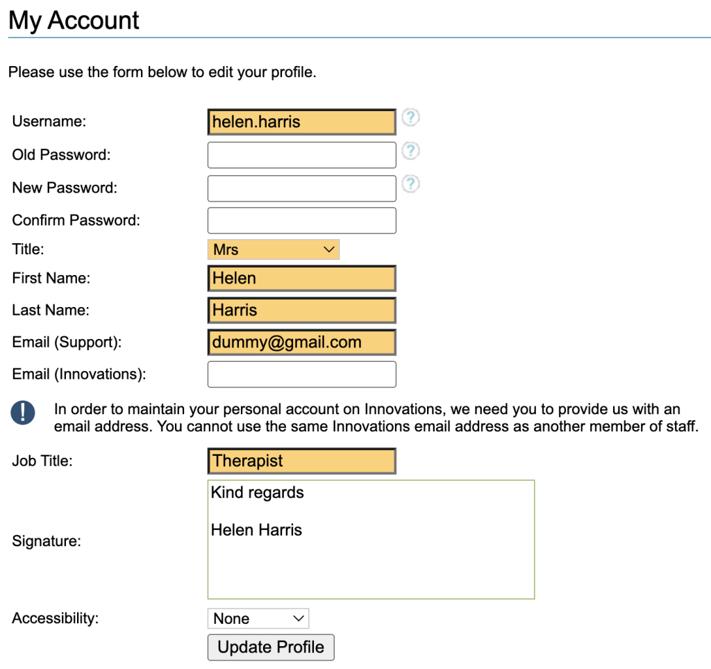 Check that your email address is correct for support and add one, if you wish to use this feature, under innovations, . These will be used for receiving updates on any support logs or innovations that you raise.