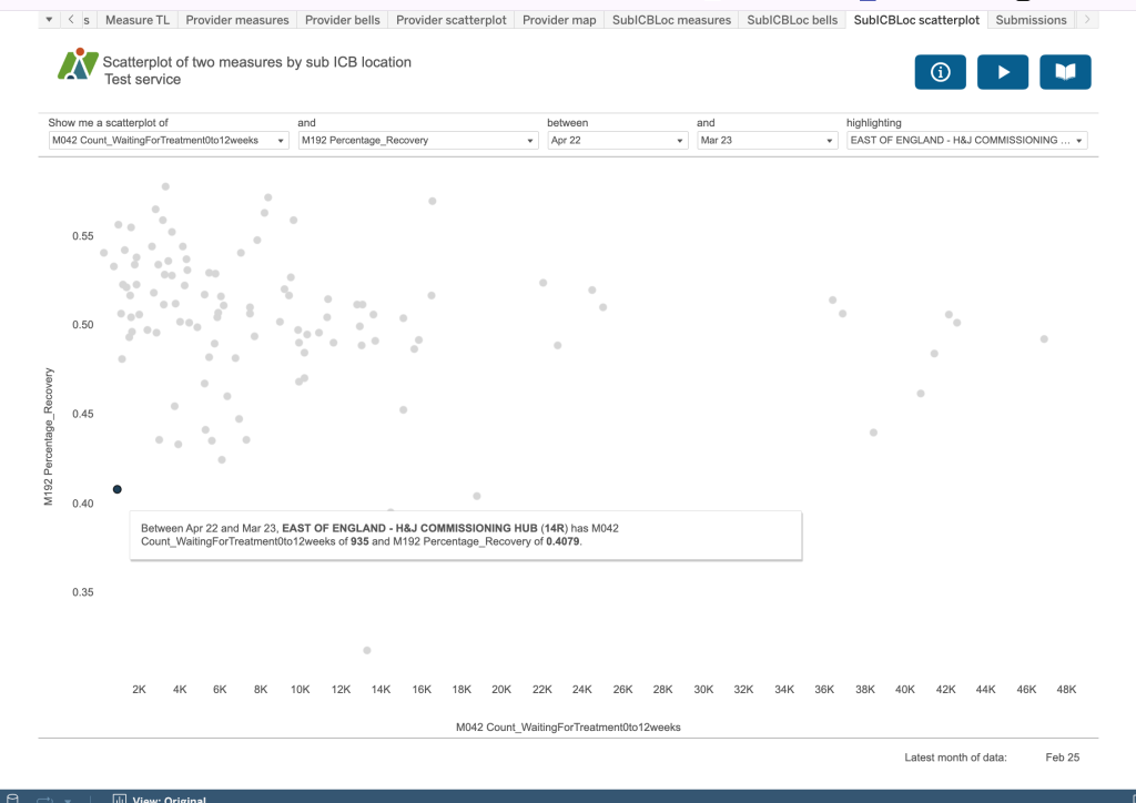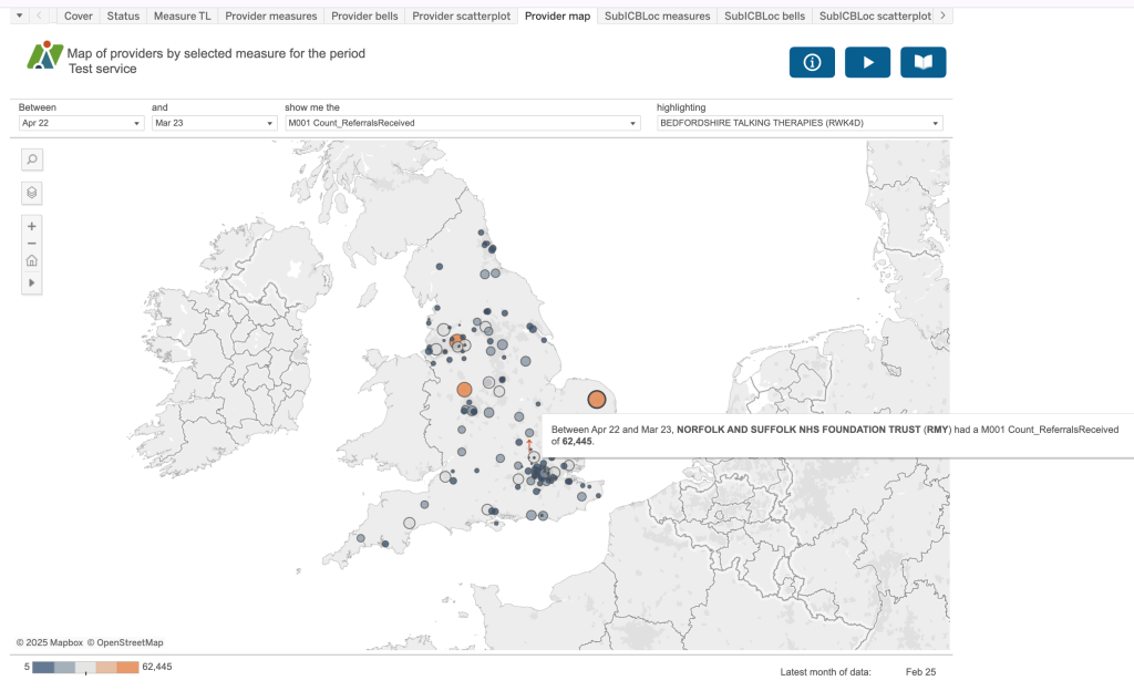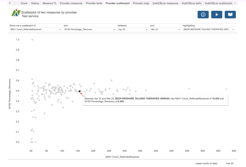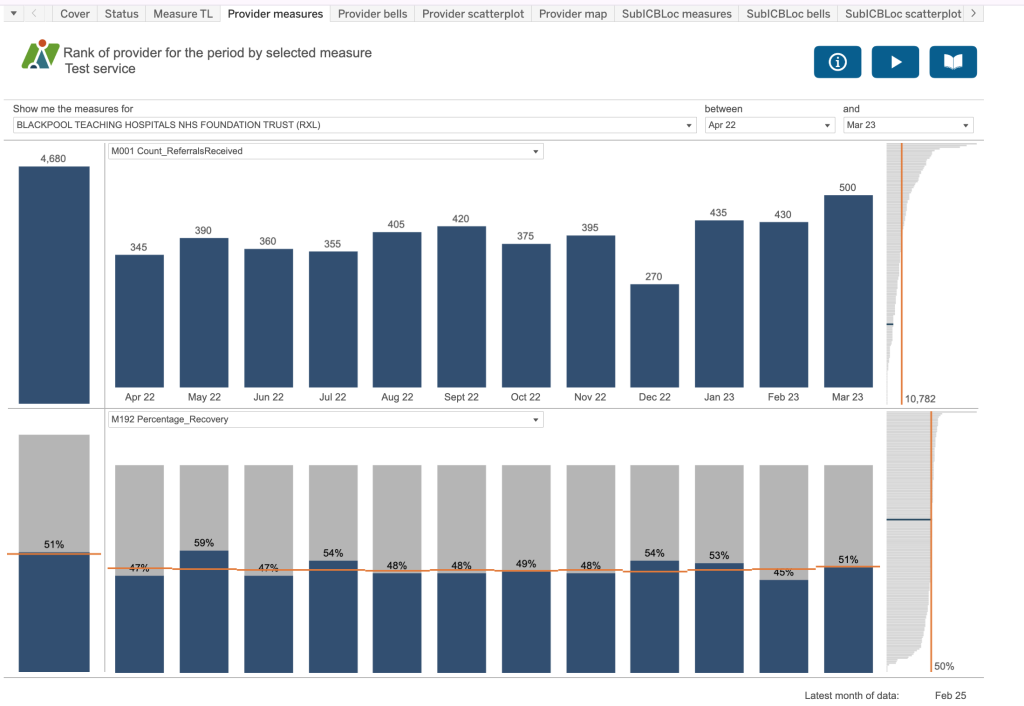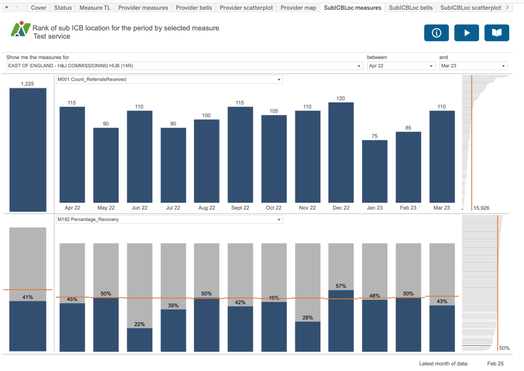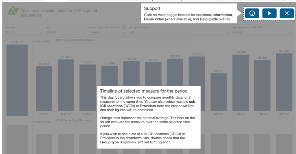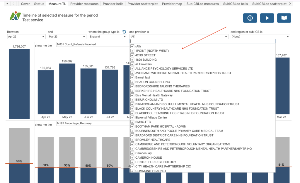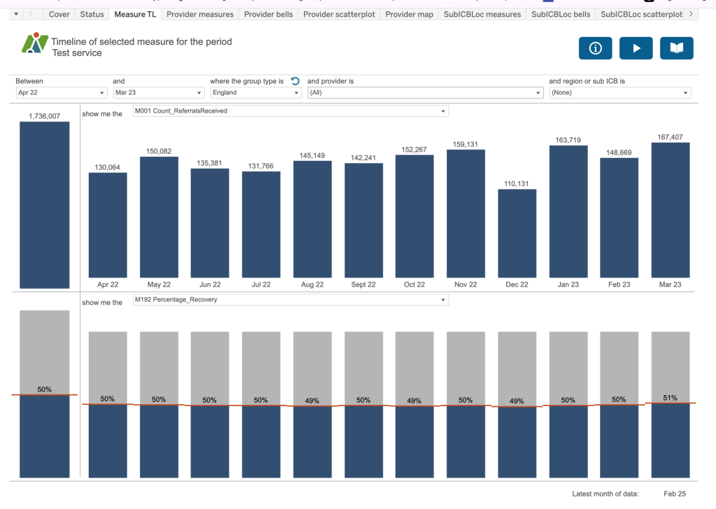 Use the boxes at the top of the dashboard to create a sentence that most accurately describes the analysis you require. For example, “Between April 2022 and March 23 where the Group type is England and provider is All and sub ICB is all SubICBs show me the M001 Count of referrals received” and “show me the M192 Percentage recovery”. So you can see two different measures on the dashboard at any one time.