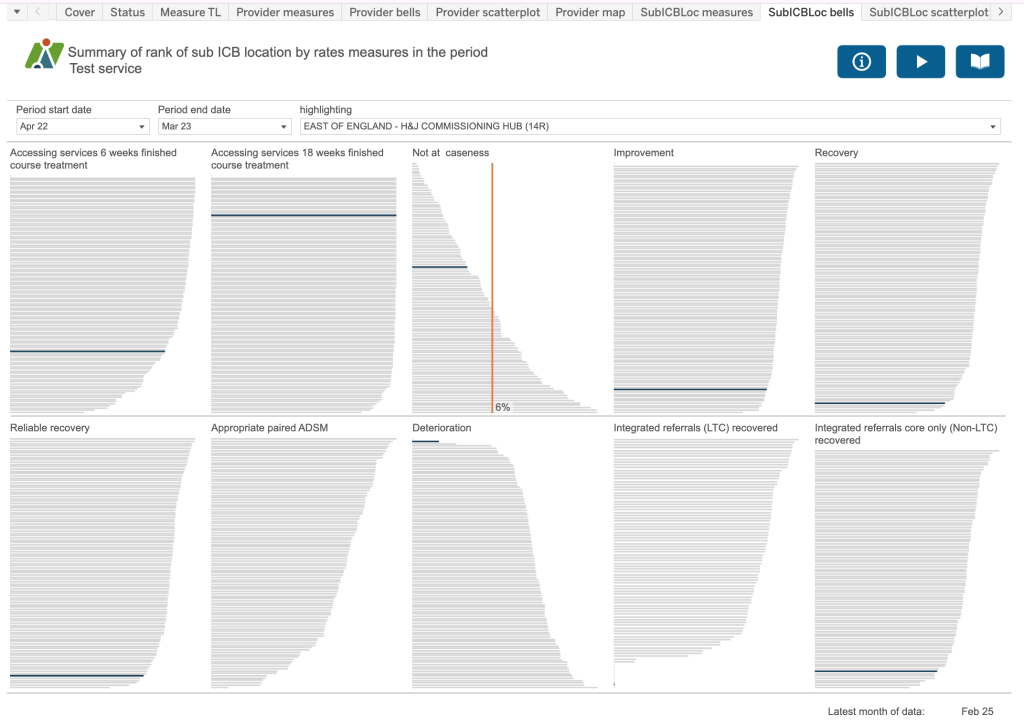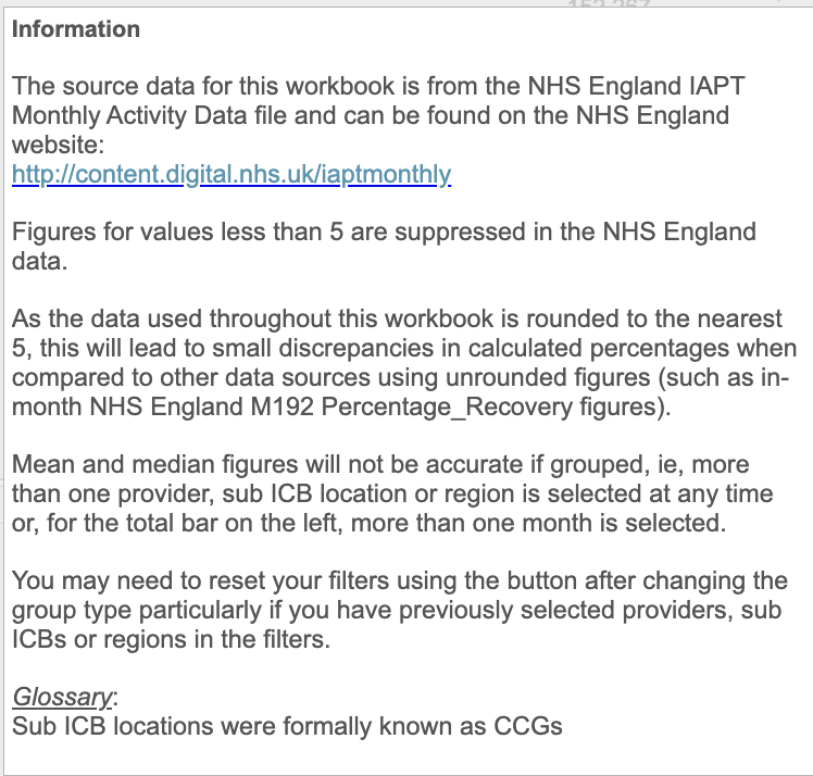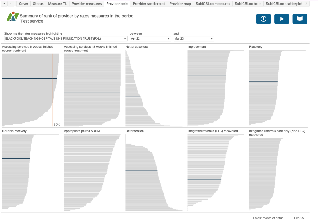 This dashboard takes 10 key rates measures for example, the proportion of referrals which finished a course of treatment that accessed services (or had their first treatment appointment) within six weeks of referral, or the proportion of referrals ended which were not at initial caseness. If you look in the information button, it will identify the measures included on this dashboard so that you can refer back to the metadata documentation for precise definitions and construction.