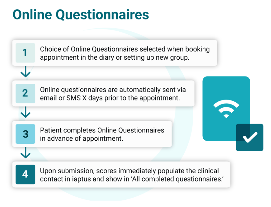 - This setting will send Online Questionnaires out via email by default. But, if the patient’s email address is missing and/or Webforms permission is missing, iaptus will then check for a mobile number and SMS permission. If these SMS details are present, outcome measures will be sent via SMS.