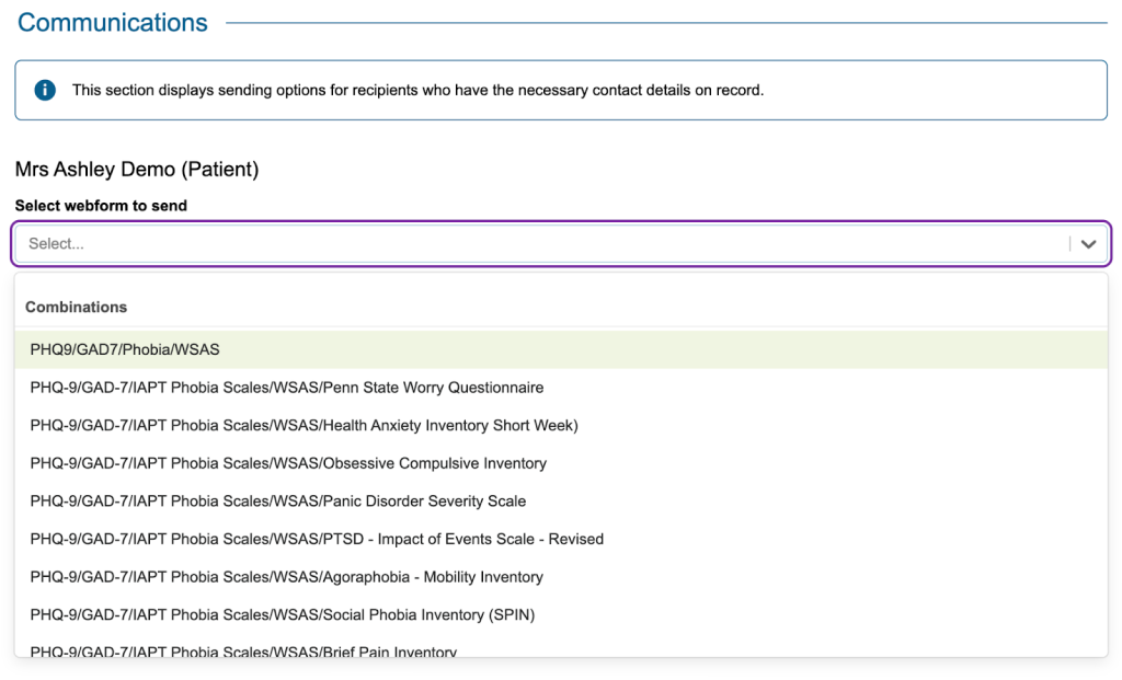 When booking the appointment in the diary, under the ‘communications’ section, you will see the list of questionnaires that can be sent to the patient under the heading ‘Select webform to send’’. You will need to select which questionnaire or set of questionnaires to send to the patient. You can select one or multiple options in this dropdown. Pre-set combinations will appear at the top with individual questionnaires listed underneath.