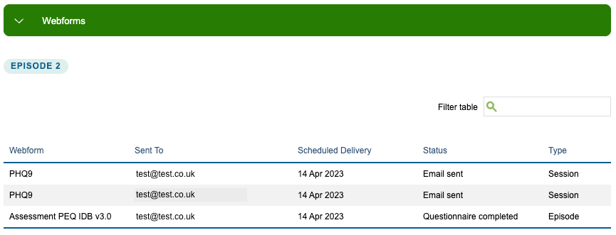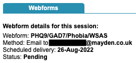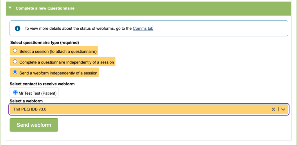 At the bottom of the Clinical Contact tab, you can select to send certain questionnaires independently of a session. Once you have clicked “Send webform” this will send the form to the patient. Please note this functionality is only available where questionnaires are not scored and do not need to be attached to a clinical session.