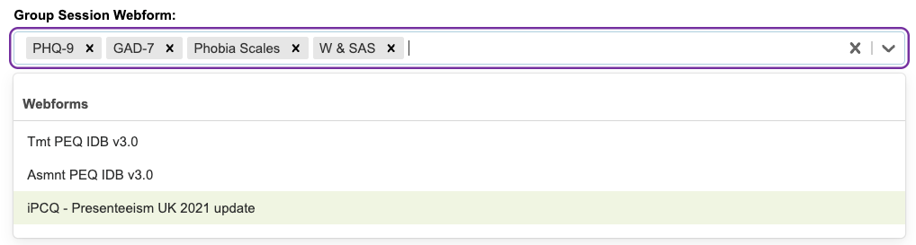 When creating a new group you have the opportunity to select an Online Questionnaire or a combination of Online Questionnaires to send to the patients. This can be seen in the image below. iaptus will automatically create a form for all future sessions within that group when an attendee is added to the group.