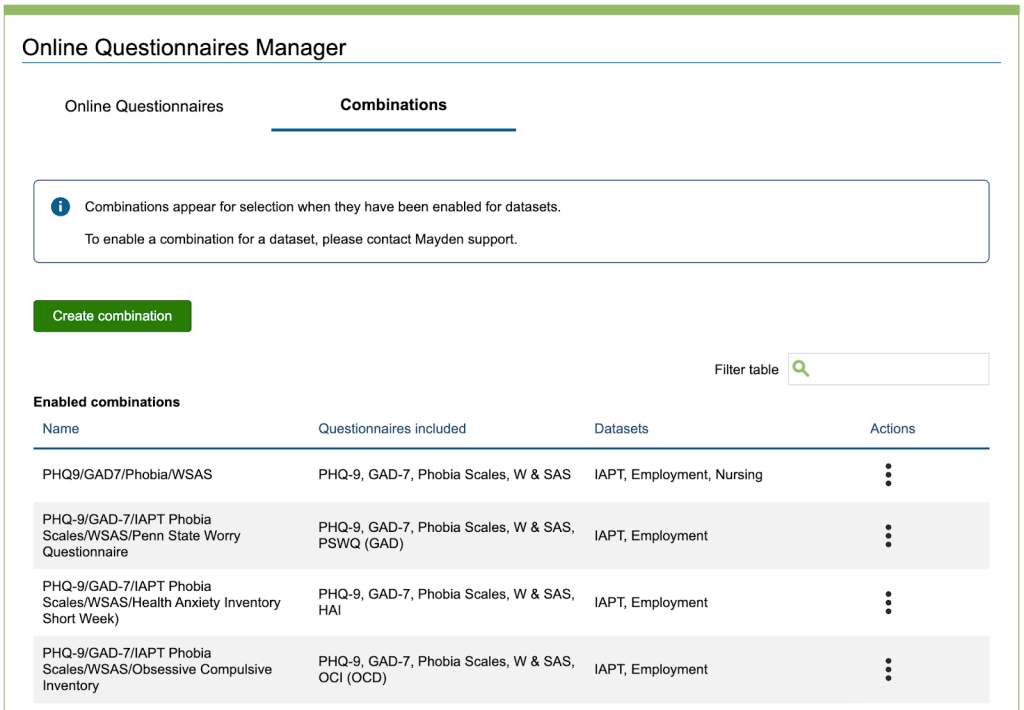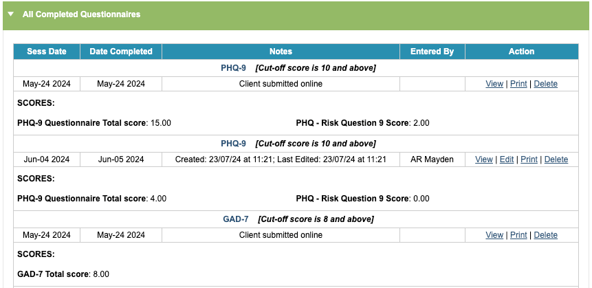 The ‘Notes’ column includes an indication of whether the questionnaire was submitted online or completed with a therapist in session.
