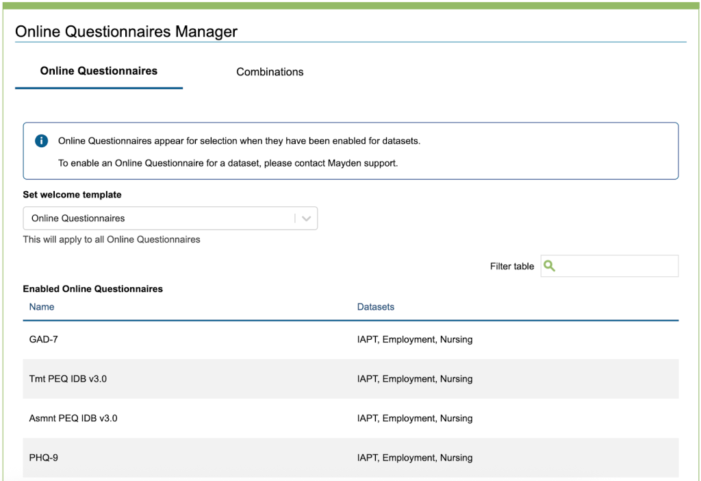 Your superusers can be provided with access to the Online Questionnaire Manager. Here they will be able to view the Online Questionnaires that are currently enabled in the Online Questionnaires tab. There is also a filter field to search for specific online questionnaires that have been enabled.