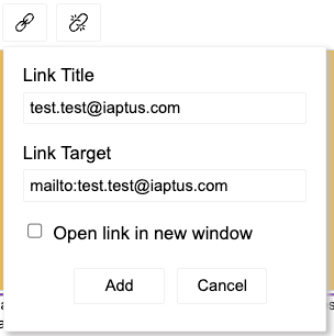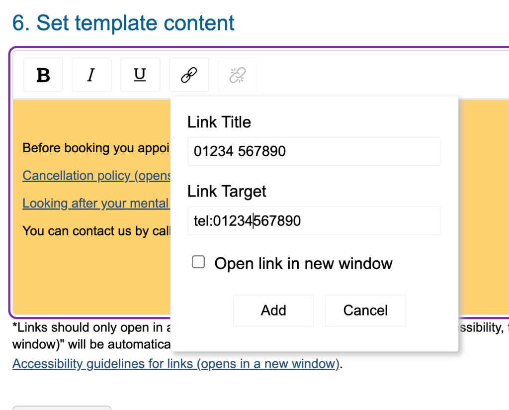 You can also link to a telephone number or email address so that when clicked on, it will automatically open for calling or emailing. To do this, enter the number or email address as shown in the examples, making sure the link target contains no spaces and begins with either tel: or mailto: